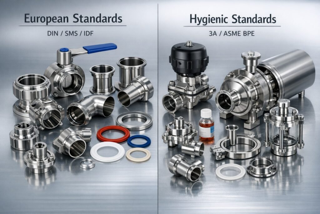 DIN, SMS, IDF standards are commonly used in European food and beverage processing systems.